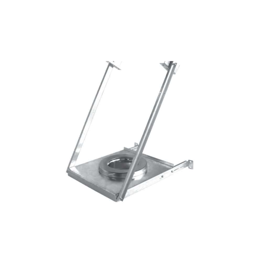 Used to support the insulated tee in a through-the-wall chimney installation. Access for inspection and maintenance is integrated on the underside of the bracket. The adjustable arms and sliding base are factory-set to guarantee a minimum clearance to combustible materials of 2″ (5 cm) to 7″ (17.7 cm) from the wall.