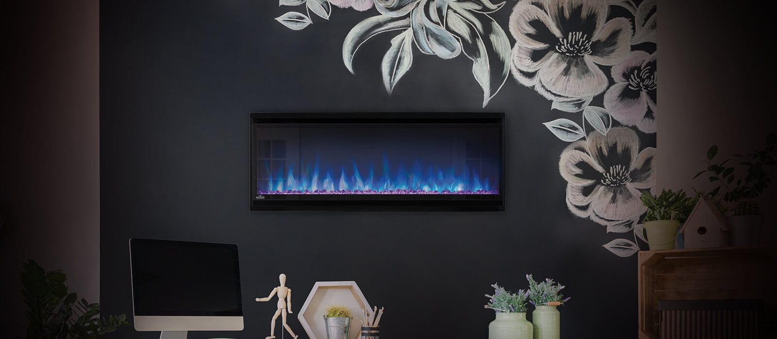 See the fireplace, not the frame with Napoleon’s Alluravision™ Series linear electric fireplaces. They stand out with their nearly frameless viewing area which highlights the unique flame colors. Set the mood with yellow, orange, blue and multicolor flames at the push of a button. Easy to use, these electric fireplaces are plug and play – just hang on the wall and plug them in. They can also be hardwired to hide the plug. The NIGHT LIGHT™ and glass media with driftwood make stylish additions.
