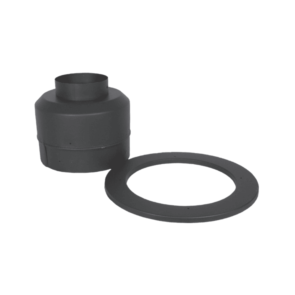 Round Finishing Support for use on flat ceiling. 6″ diameter only. Fits within 12-3/8″ x 12-3/8″ frame. Integrated adapter accepts either singlewall or double-wall stovepipe. Removable trim collar allows collar to be fastened in place after finish of ceiling is completed.