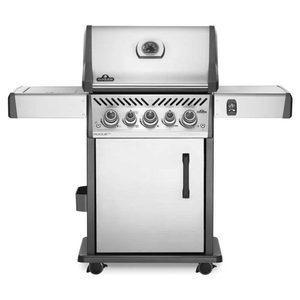 The Napoleon Rogue® SE 425 Stainless Steel Propane Gas Grill with Infrared Side Burner and Rear Burner is a durable stainless steel grill. Featuring three main burners, a rear rotisserie burner, and a high top lid, this grill has everything you need to create gourmet meals. Sear restaurant-style steaks on the integrated sear station, while generous side shelves provide plenty of prep space.