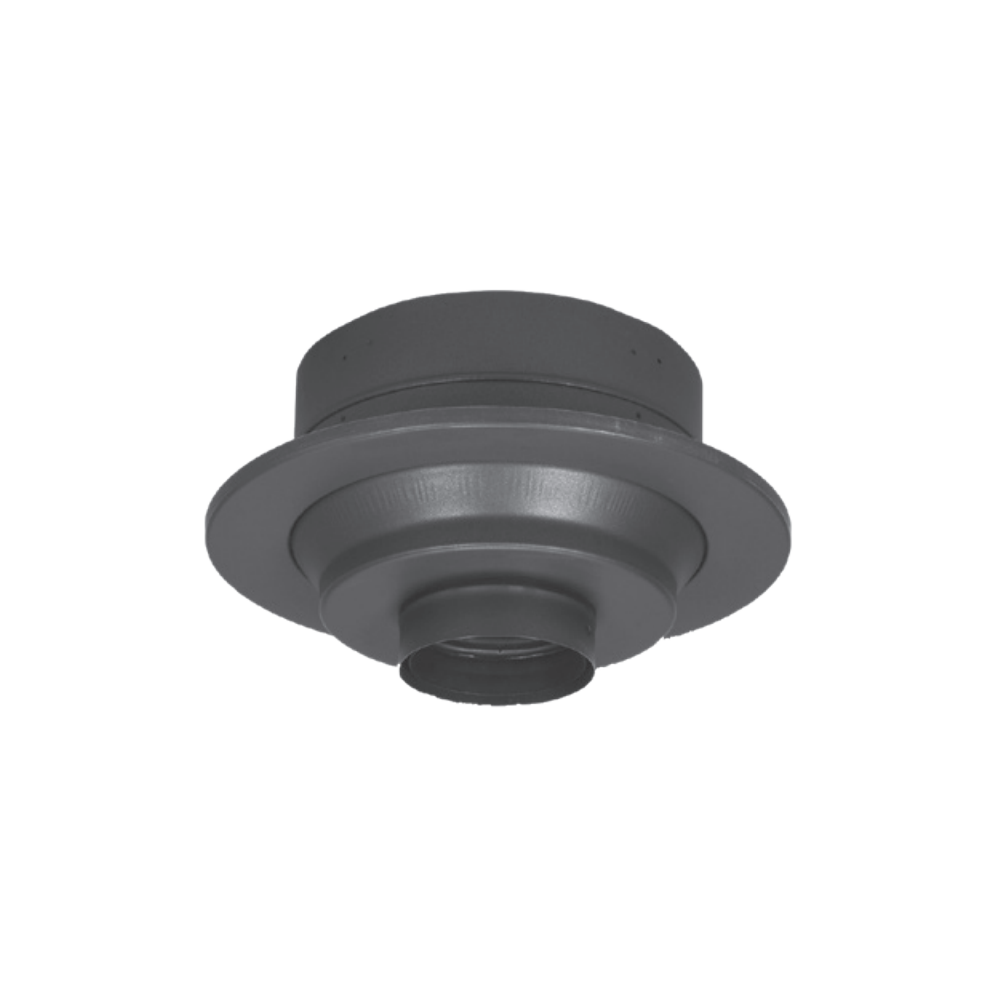 Same as above, except that the finishing collar is fixed; not removable. Integrated adapter accepts single- or double-wall stovepipes