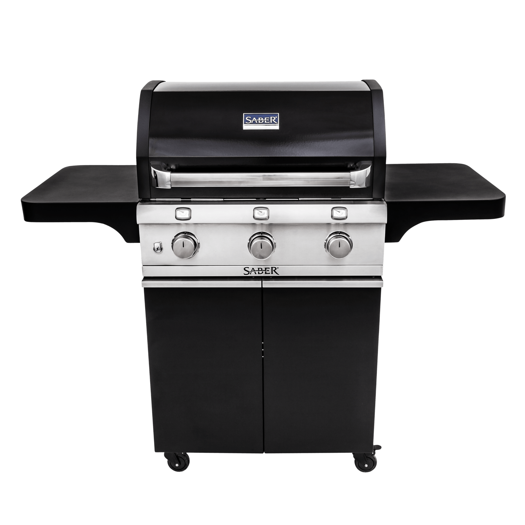 The SABER® Deluxe Black 3-Burner Gas Grill features a stylish design and a premium grilling experience with a generous cooking space featuring zonal cooking. This grill features a sleek, powder-coated finish and a lid with die cast aluminum end caps. Enjoy consistent grilling results from SABER’s patented cooking technology that ensures even heat at every temperature while eliminating flare-ups.