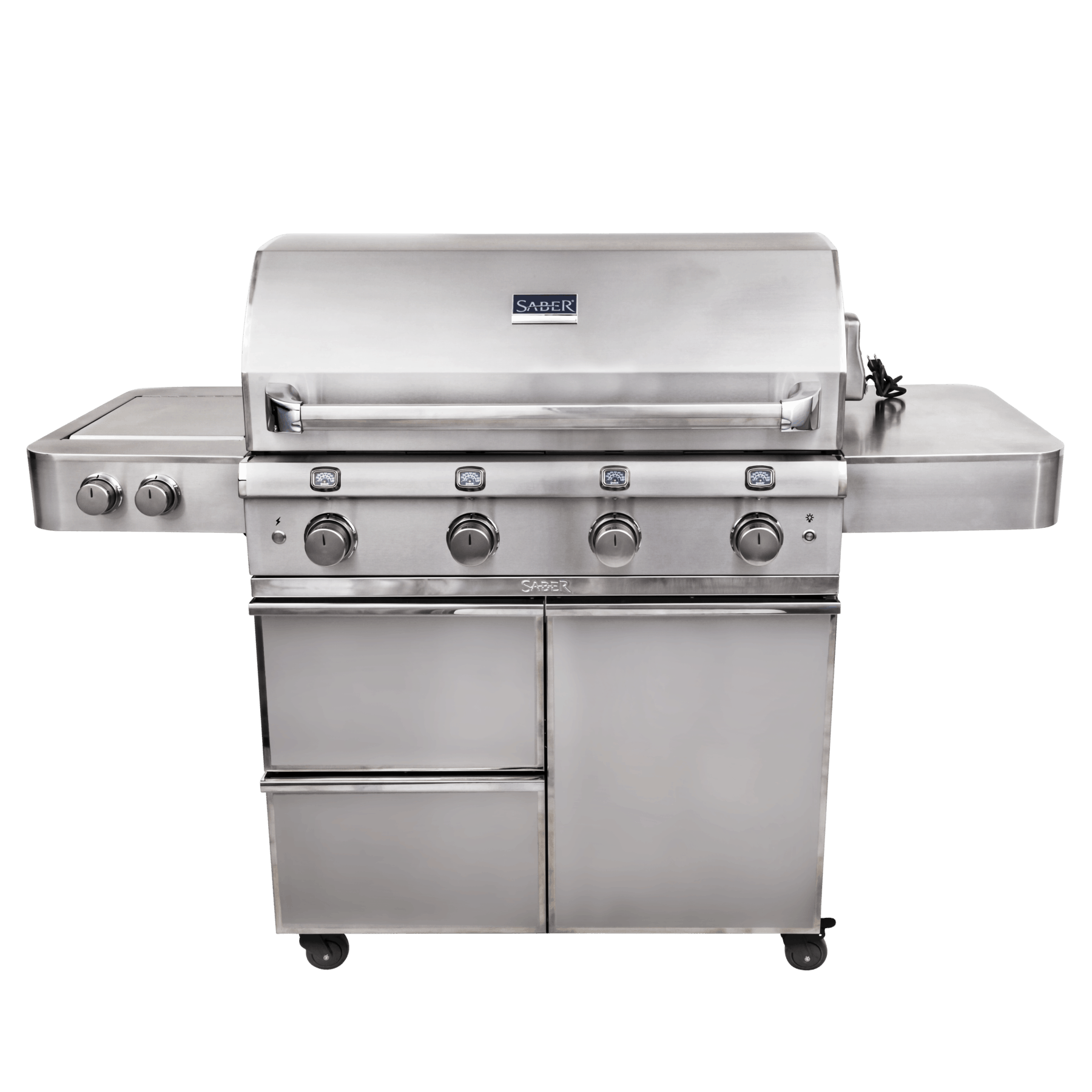 The SABER® Elite Series 4-Burner Gas Grill combines all stainless steel and patented cooking technology for upscale entertaining at home. Built to last, the triple insulation and premium 304 stainless steel ensure durability while mirror polished accents provide stylish sophistication. SABER’s exclusive grilling system allows for the flexibility in cooking at both high and low temperatures with even heat and no flare-ups. Entertain with ease, preparing the entire meal on the generously sized cooking space and dual control side burner. Enjoy easy access to tools and seasonings stored in the drawers and cabinet.