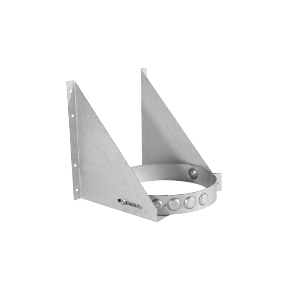 Used to support the chimney on a vertical wall. Triangular plates allow 2 3/4″ adjustment from the vertical surface. This bracket can be used as a wall bracket above the insulated tee, or as a support for offsets. See table for load capacity. For short applications, the wall bracket can be used in place of the tee support. Universal design can be used on 5″ (12.7 cm), 6″ (15.2 cm), 7″ (17.7 cm) or 8″ (20.32 cm) conduits.