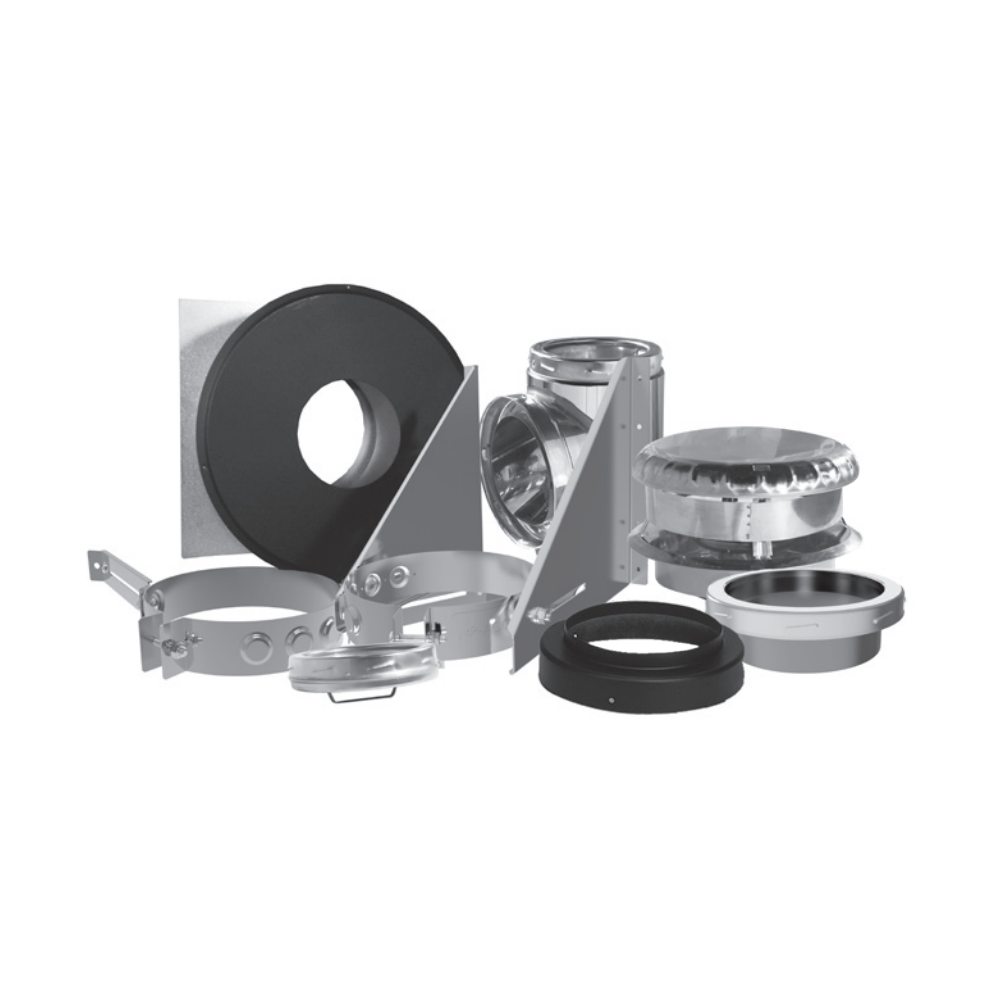 Kit includes: insulated wall radiation shield, tee, twist-lock tee cap, wall bracket, wall flange, flue extension, decorative collar for DL stove pipes and rain cap. With this option, the tee can be positioned only above or below the wall bracket.