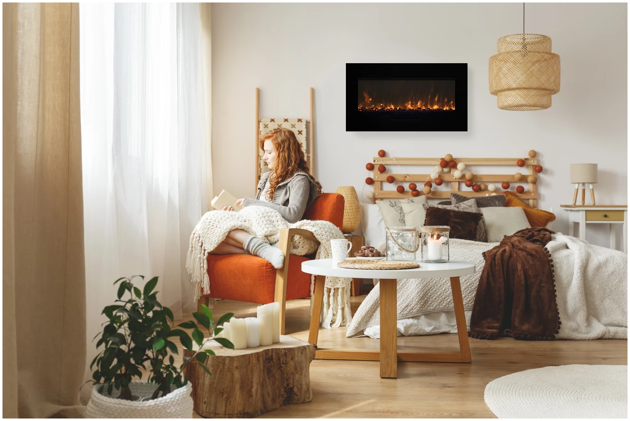 Heat is emitted from a single slot in the face of the surround. 13 colors of surround back-lighting illuminate spaces creating even more ambiance. All Built-In Flush Mount / amantii wall mount electric fireplaces come standard with a driftwood style log set and optional decorative media of EMBER are available for purchase.