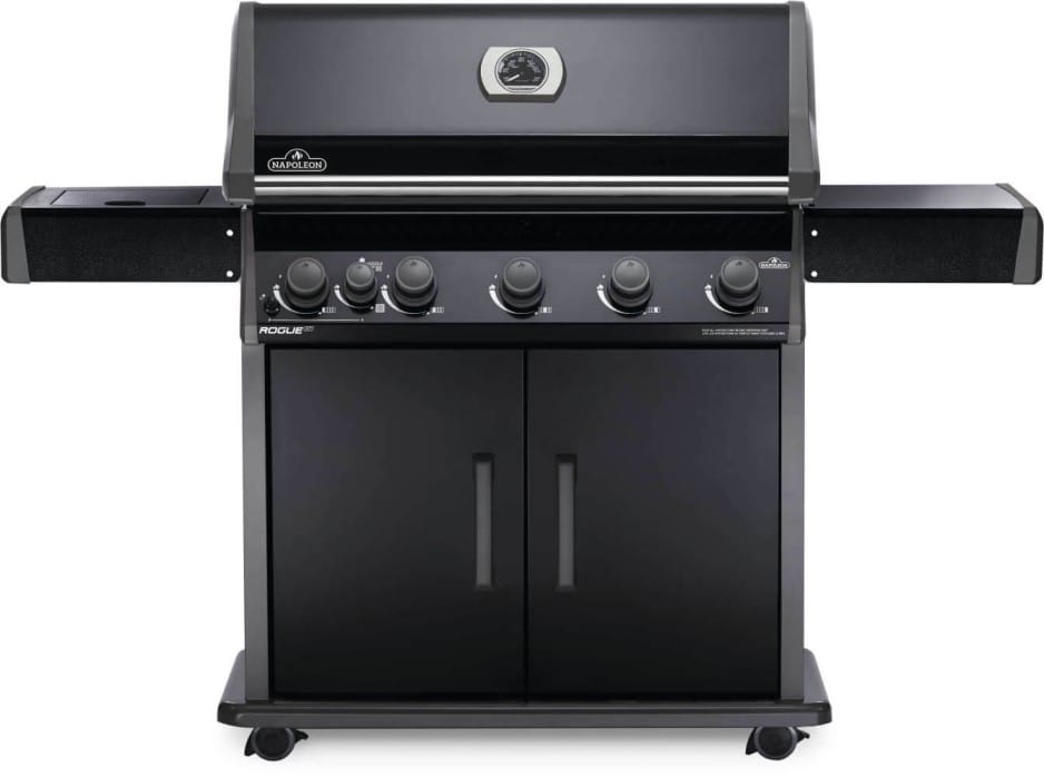 Le gril Rogue® 625 au propane de Napoleon en fini noir avec brûleur latéral infrarouge est un grand gril à gaz durable et facile d’entretien. Doté de cinq brûleurs principaux, de plaques de brûleurs en acier inoxydable, de grilles de cuisson en fonte et d’un couvercle de haut format, ce gril offre tout ce dont vous avez besoin pour créer des repas gastronomiques. Faites saisir les steaks comme au restaurant sur le brûleur latéral infrarouge intégré tout en profitant des grandes tablettes latérales qui offrent beaucoup d’espace pour la préparation.
