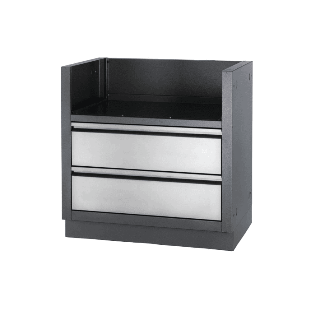 Spécialement conçu pour les grils encastrés de 32 po de la série 700, ce cabinet en acier galvanisé recuit avec peinture à base de poudre de couleur graphite est doté d’un fini plus durable grâce à un revêtement spécial à deux couches. Deux tiroirs en acier inoxydable sont montés sur des rails coulissants et procurent de l’espace de rangement sous le gril. L’installation est simplifiée grâce aux plaques poinçonnées qui facilitent les raccordements électriques et l’installation de la tuyauterie pour le gaz. Les pieds de nivellement assurent que le cabinet soit de niveau même si votre terrasse ne l’est pas parfaitement. Ajoutez un gril encastré de 32 po de la série 700 et les modules OASISᴹᴰ de votre choix afin de créer votre OASISᴹᴰ extérieure personnalisée.