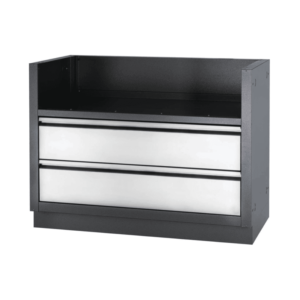 Spécialement conçu pour les grils encastrés de 44 po de la série 700, ce cabinet en acier galvanisé recuit avec peinture à base de poudre de couleur graphite est doté d’un fini plus durable grâce à un revêtement spécial à deux couches. Deux tiroirs en acier inoxydable sont montés sur des rails coulissants et procurent de l’espace de rangement sous le gril. L’installation est simplifiée grâce aux plaques poinçonnées qui facilitent les raccordements électriques et l’installation de la tuyauterie pour le gaz. Les pieds de nivellement assurent que le cabinet soit de niveau même si votre terrasse ne l’est pas parfaitement. Ajoutez un gril encastré de 44 po de la série 700 et les modules OASISᴹᴰ de votre choix afin de créer votre OASISᴹᴰ extérieure personnalisée.