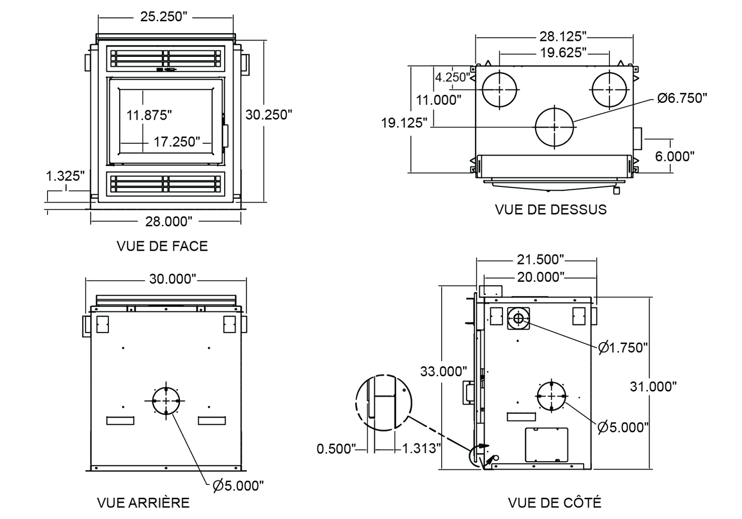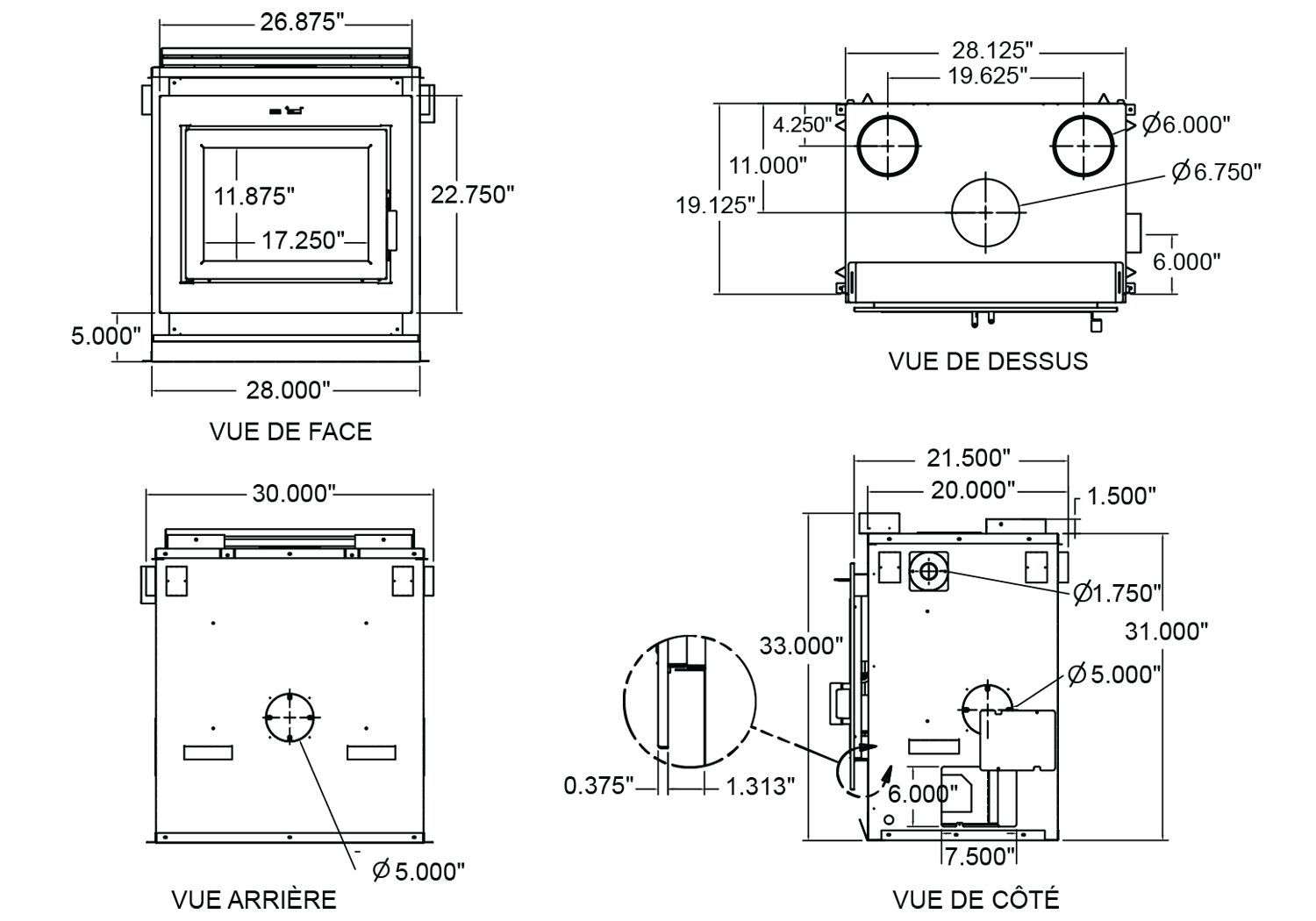 | Cheminée: | 6 pouces (veuillez vous référer au manuel d’utilisation pour la liste complète) |