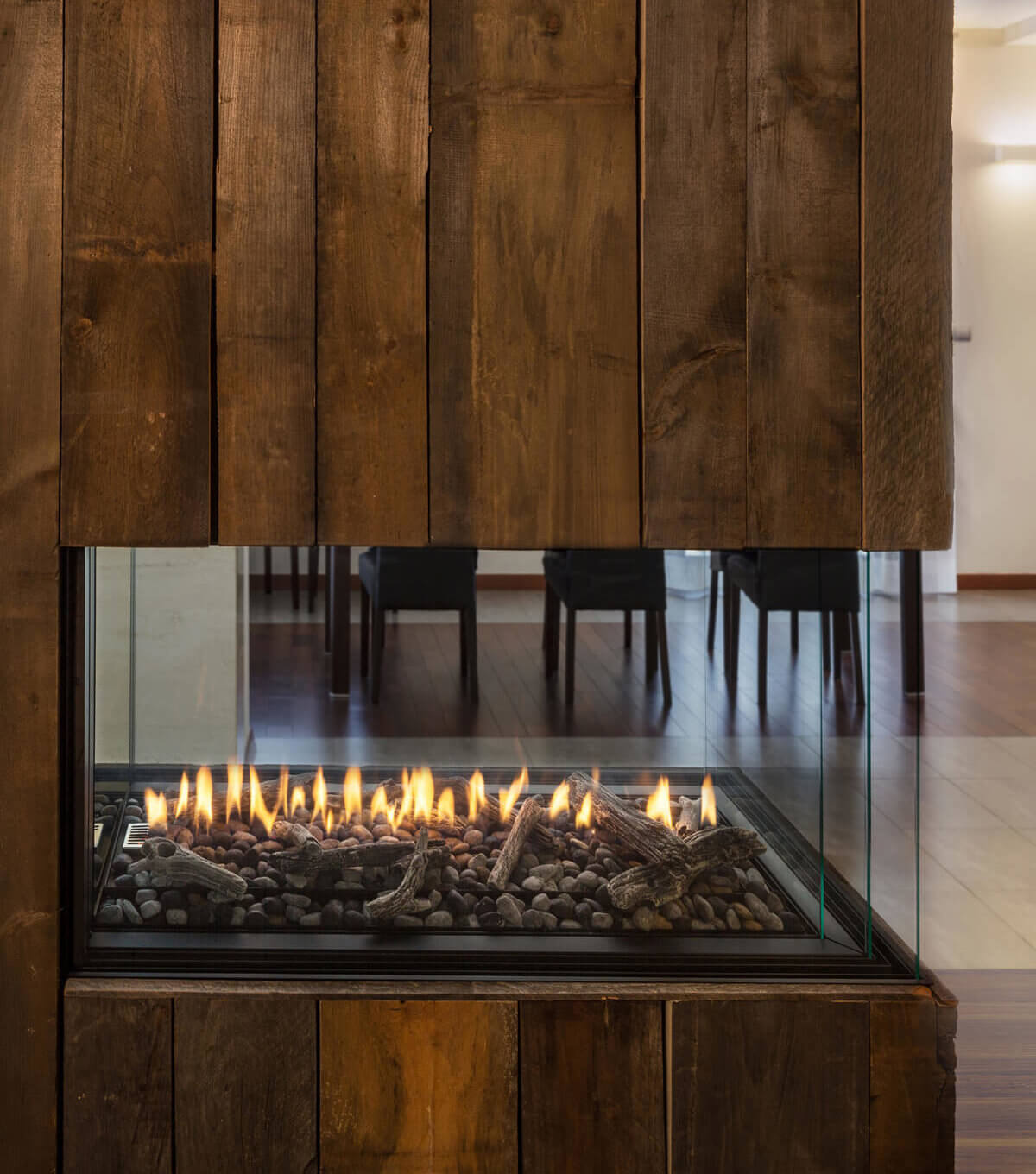 L’EXEMPLAR se caractérise par une zone d’observation paysagère généreuse et un brûleur linéaire. Des matériaux combustibles peuvent être installés sur la chambre de combustion sans dégagement pour un look épuré et minimaliste.