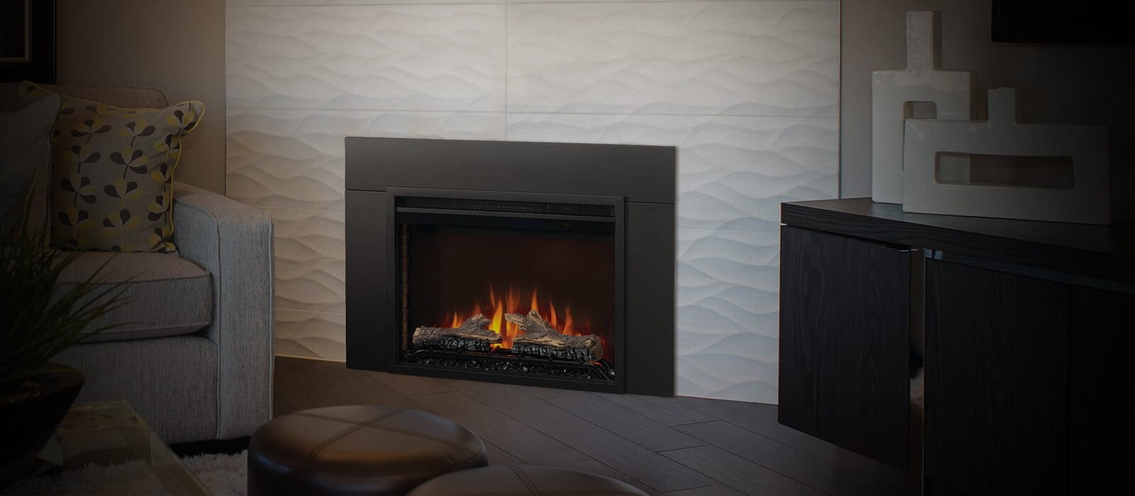 • Electric fireplace insert with a clean, contemporary finish
