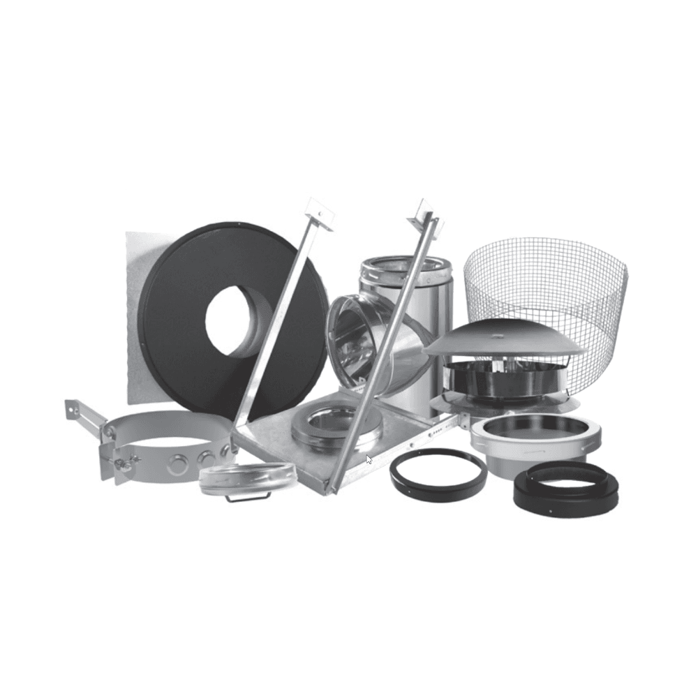 Le kit comprend : un coupe-feu mural isolé, un té, un capuchon de té à verrouillage par rotation, un support de té avec coupleur, une bride murale, un prolongement de conduit, des colliers décoratifs pour les tuyaux de poêle DVL et DDW, un chapeau pare-pluie et un pare-étincelles. Avec cette option, le té est positionné uniquement au-dessus du support de té.